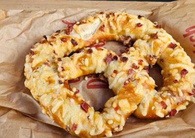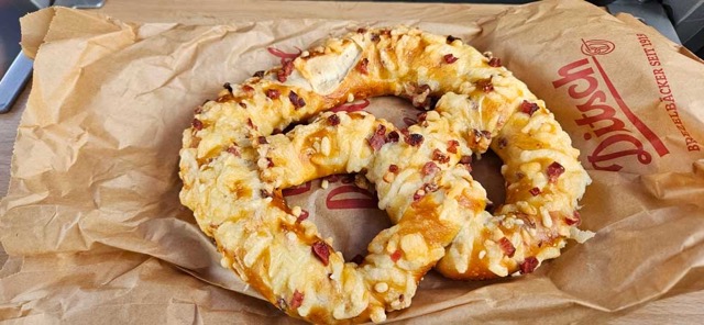 When we are catching an early train, we will often stop at a bakery for a bite for the journey. This was a tasty ham and cheese pretzel (brezel).