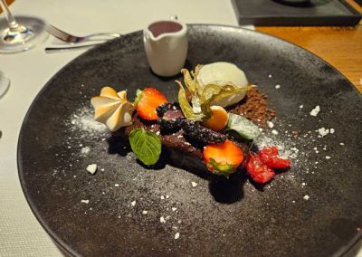 We only order dessert if it’s really going to be amazing. This was worth it! Flourless chocolate cake with gelato and fresh fruit. (Yes, I ate all the fruit.) The round yellow fruit with the wild leaves is a kind of gooseberry that they use a lot as a dessert garnish.