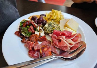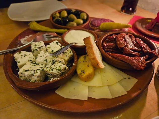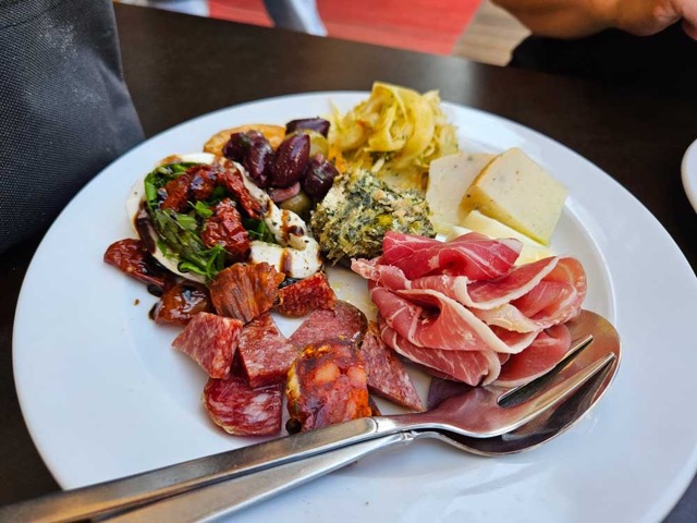 Another Mediterranean “bits and pieces” meal at a local salumeria–a lot like tapas, but Italian. With a little basket of bread and a salad, a plate like this is surprisingly filling and oh so good.