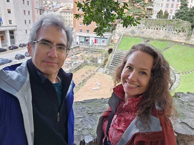 We slowly made our way out of the Monday morning traffic of Zagreb and onto the highway. We drove back through Slovenia because we had our sights set on Trieste, Italy. It’s a port city on the Adriatic Sea and we were happy to be in Italy. The town spills down the hills to the port and the narrow, winding roads were an adventure for Nathan to drive through. Luckily, the room we booked had a reserved spot for us in a garage, so we tucked the car into it and set out to explore the town. This was the day we did the most walking…like 30,000 steps. We peppered the walking with historical places and stops for pastries and drinks. Trieste was a Roman port and also became the main port for the Austro-Hungarian Empire, so it has a rich tradition of cafés and food. It’s also one of those delightful places where different peoples have collided repeatedly over the centuries, so it has deep and interesting culture. They have four official languages: Italian, German, Slovenian, and a regional romantic language called Friulian. It has a gorgeous main piazza facing the sea and lots of areas to explore. We had to stop in for our first real Italian dinner and we ended the day watching the sunset over the sea. The day felt like spring and it was so pleasant!