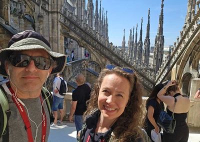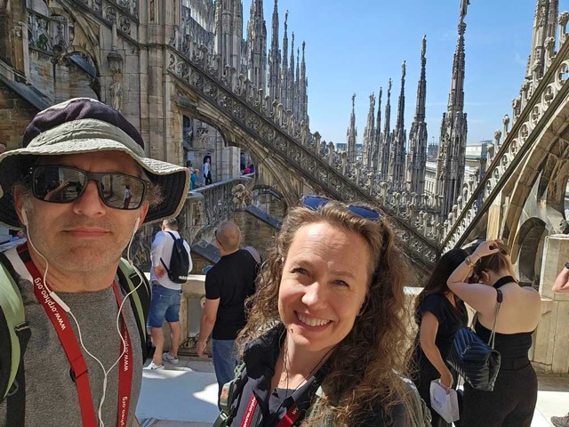 The next morning, we were up and out. We stopped by a neighborhood cafe for a morning croissant and a drink, just like everybody else in the area…the place was crazy! We had two tours booked, but we had a little extra time, so we went to the museum for the famous opera house, La Scala. We watched a rehearsal on stage with some ballet students and the tech crew. We also saw some stunning costumes and other items pertaining to the opera house. Then we headed to the Duomo for our guided tour there. The Duomo was great, but the tour was just ok. It was during a mass service, so it was hard to hear the tour guide. I found it strange that they would allow all the tourists in during the service. Our tour was supposed to be in English, but our tour guide wasn’t all that fluent. But the building and windows are stunning and it was nice to hear some of the history. It’s another building that was built on the site of a previous church, which was built on the site of a Roman temple. It took hundreds of years to complete, much like the cathedral in Köln. We got to visit some of the archaeological dig below the church as well as the roof. Walking around amongst the statues and flying butresses on the roof was really fun. All the gothic spires are decorated with statues, including statues on the tops of each spire. There are more than 3,400 statues decorating the Duomo.