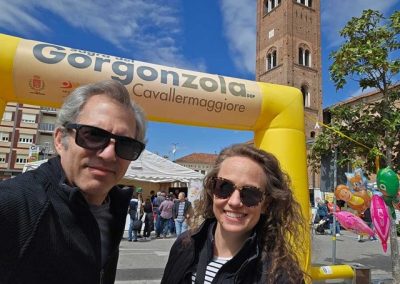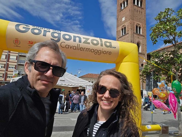 Our last experience was probably our most authentically “Italian” so far. Italian communities hold festivals called “sagras” celebrating a local saint or a product of the region. Some estimate 20,000 to 30,000 sagre are held in Italy every year. We visited the town of Cavallermaggiore for the Sagra del Gorgonzola. We like blue cheese, especially gorgonzola, so we thought this might be fun. We reserved two seats for the community lunch and drove an hour to the town. The weather has turned cold again here, but we (relunctantly) bundled up and went to see what this festival was all about. There were the predictable things, like street food vendors and some music. There were also some strange booths set up, like the vacuum salesman and the table with underwear for €1. We stopped and talked to a guy from Sicily who had a booth selling cannoli and pistachio products. He filled two little cannoli shells with sweet ricotta and topped them with pistachio cream for us…heavenly!